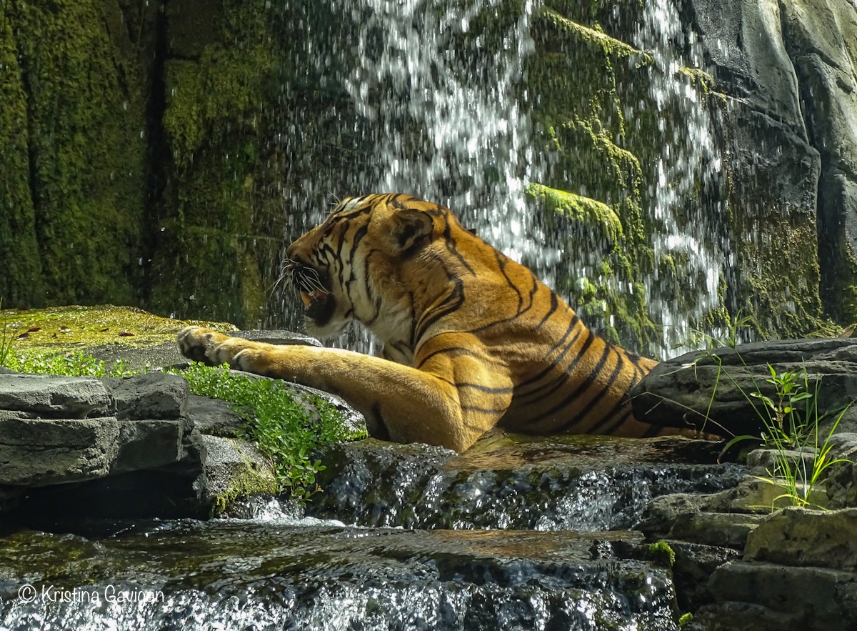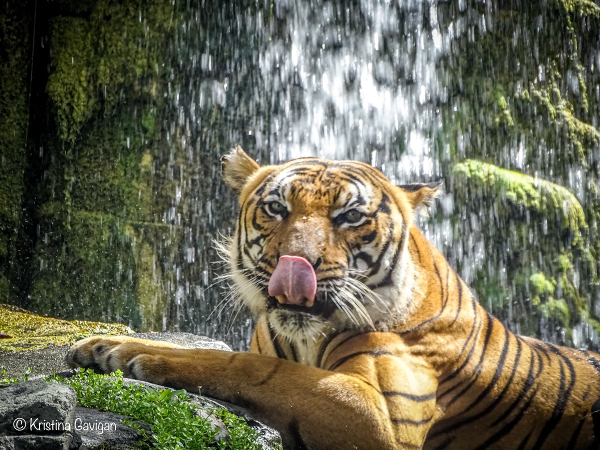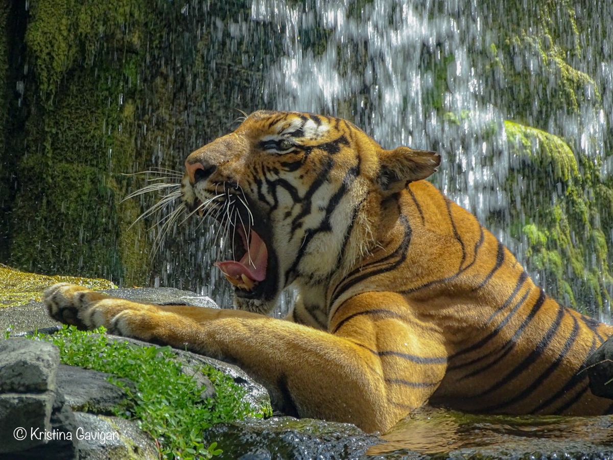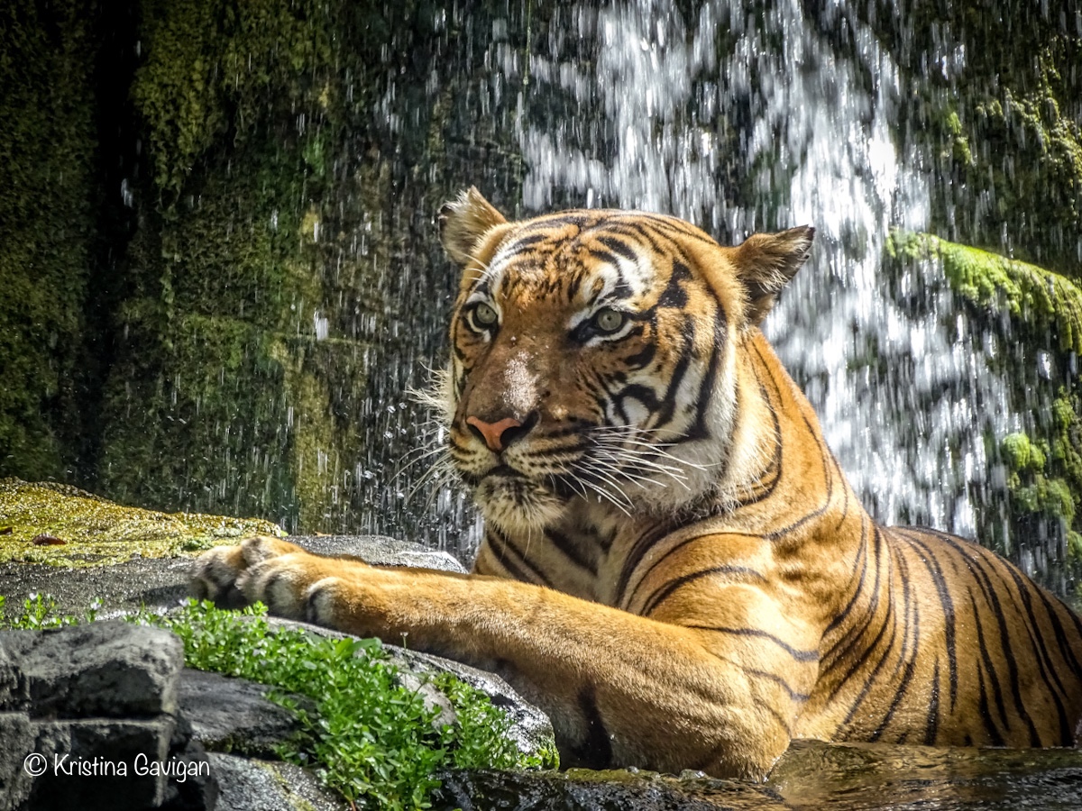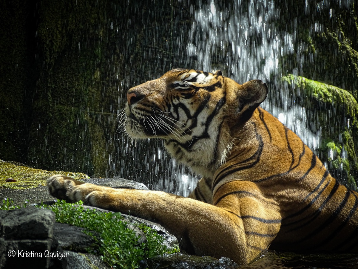 Seeing the Malayan Tiger, Bashir, sitting there, as if he was posing for me, what a treat! Thankfully I had my camera ready and I was able to snap 5 shots (all keepers) before he decided he was ready to get out of the water and move to a more secluded spot. I was thrilled! The photos aren’t perfect, as I’m sure I moved a little due to excitement and I had to take the photos through some glass (but better than fencing, right?)